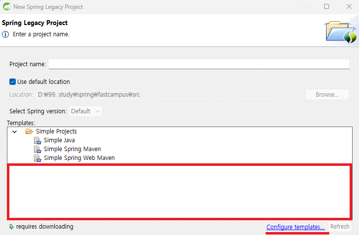 STS3로 스프링 프레임워크 프로젝트를 만들기 위해 Spring Legacy Project를 이용한다.이때 Spring MVC Project 템플릿이 없는 경우가 있다. Configure templates... 를 눌러보자. spring-data-gemfire와 spring-integration을 삭제하고 적용시키자.적용 후 확인했을 때 나오는 사람이 있고 안 나오는 사람이 있을 것이다.만약, 안 나온다면 아래의 방법을 따라 하자. 1. STS3 종료 후 워크스페이스 아래 경로로 이동.metadata\.plugins\org.springsource.ide.eclipse.commons.content.core경로로 이동하면 폴더가 비어있을 것이다. 2. https-content.xml 파일 복사하기 ..