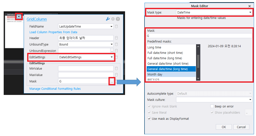 GridColumn의 스마트 태그를 통해 Mask를 설정할 수 있다.